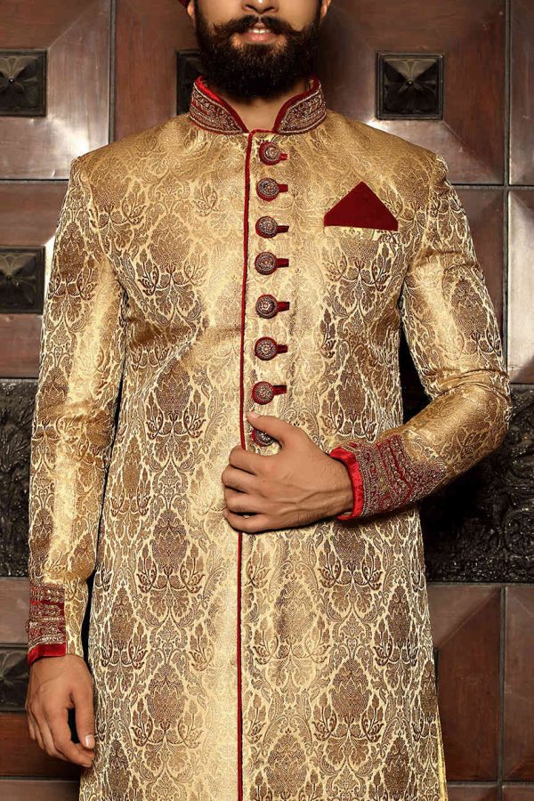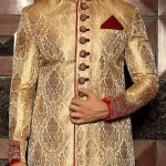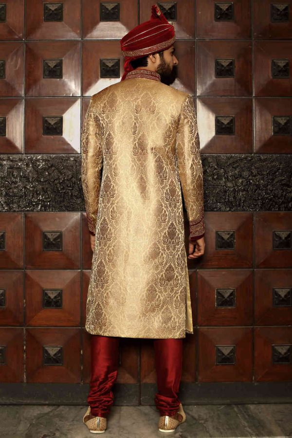 Upgrade your style game with this glowing ensemble in a fawn shade. It is both conventional and interesting.Colour, Material & Work: This sherwani is fabricated on a bold self-designed brocade material in the fawn shade. The pattern is intricate yet fulsome, hence renders a luxurious touch and feel to the sherwani. The neck and sleeves are exquisitely designed with a warm embroidery and zari work pattern in maroon. The sherwani is given a ritzy look with pebble sized ornate buttons. It has a straight hem line with a maroon detailing. This set comes with a churidar bottom in a complementing maroon shade.