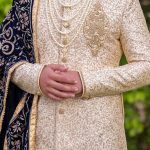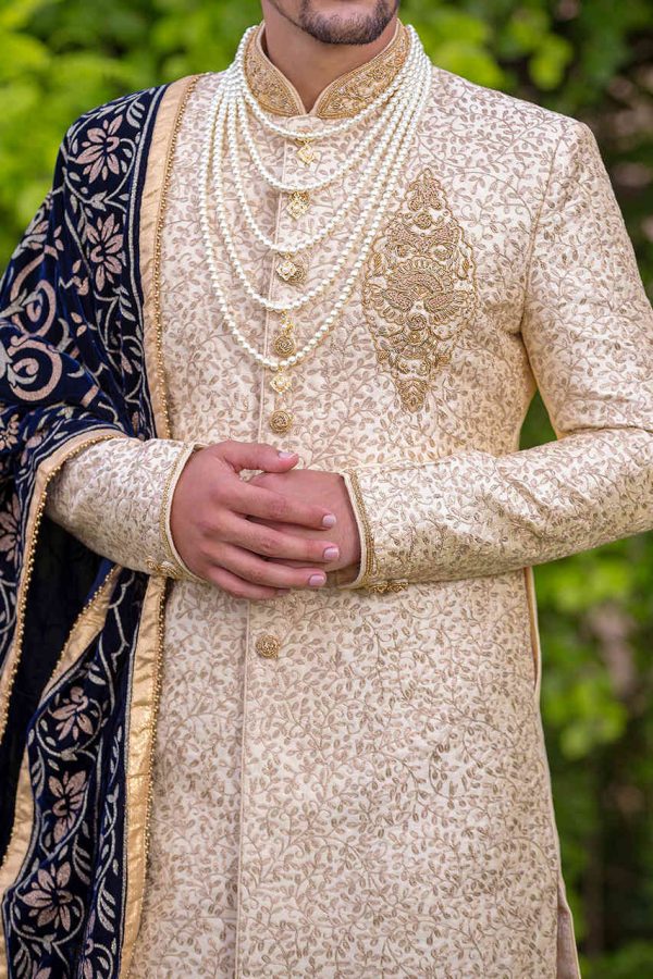 Garb yourself in a stunning masterpiece by Manyavar. This sherwani not only accentuates your personal style quotient but also fits into everything conventional and heirloom.Colour, Material & Work: This sherwani is meticulously handcrafted on a cotton silk material in beige colour. It has rich thread and zari work done all across the sherwani making it grand. The copper-gold zari work is detailed, intricate and continuous. It has a mandarin collar which is highlighted with contrasting embroidery in light gold. A similar large embroidered motif is prepared on the front-left side of the sherwani making the whole piece gaudy. It has contrasting embellished pebble sized buttons. This ensemble includes a shiny churidar bottom in the same shade of biscuit and is exclusive of jootis, safa and a dupatta.