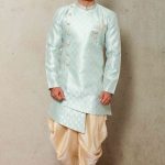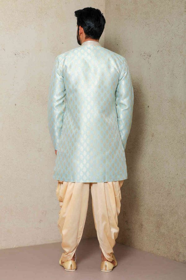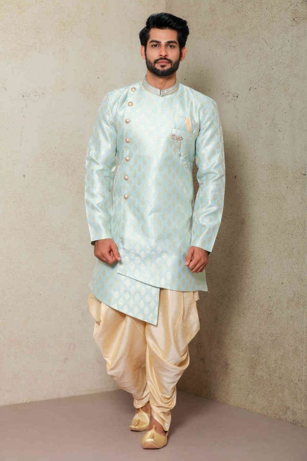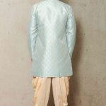 Material, Colour and work: This lux ensemble is made of jacquard material, with side buttons and gold embroidery, giving it a simple yet classy look.