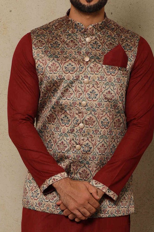 A kurta set that compliments your sense of styling, the Captivating Red kurta from the makers of Manyavar is a complete must-have for festive occasions! Material, colour and work – The kurta is made from cotton material, and come with art silk printed jacket, which has the same print detailing on the sleeves and neckline. Talk about a perfect blend of class and style!